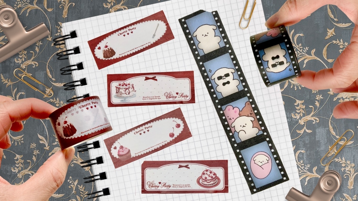 バリエーション豊富なマスキングテープ。最近はミシン目が入って切り取りやすくなったタイプも数多く登場しています。今回の私のお気に入りは、書き込みもできる<スイーツ柄>と、フィルムのような<いぬ柄>!