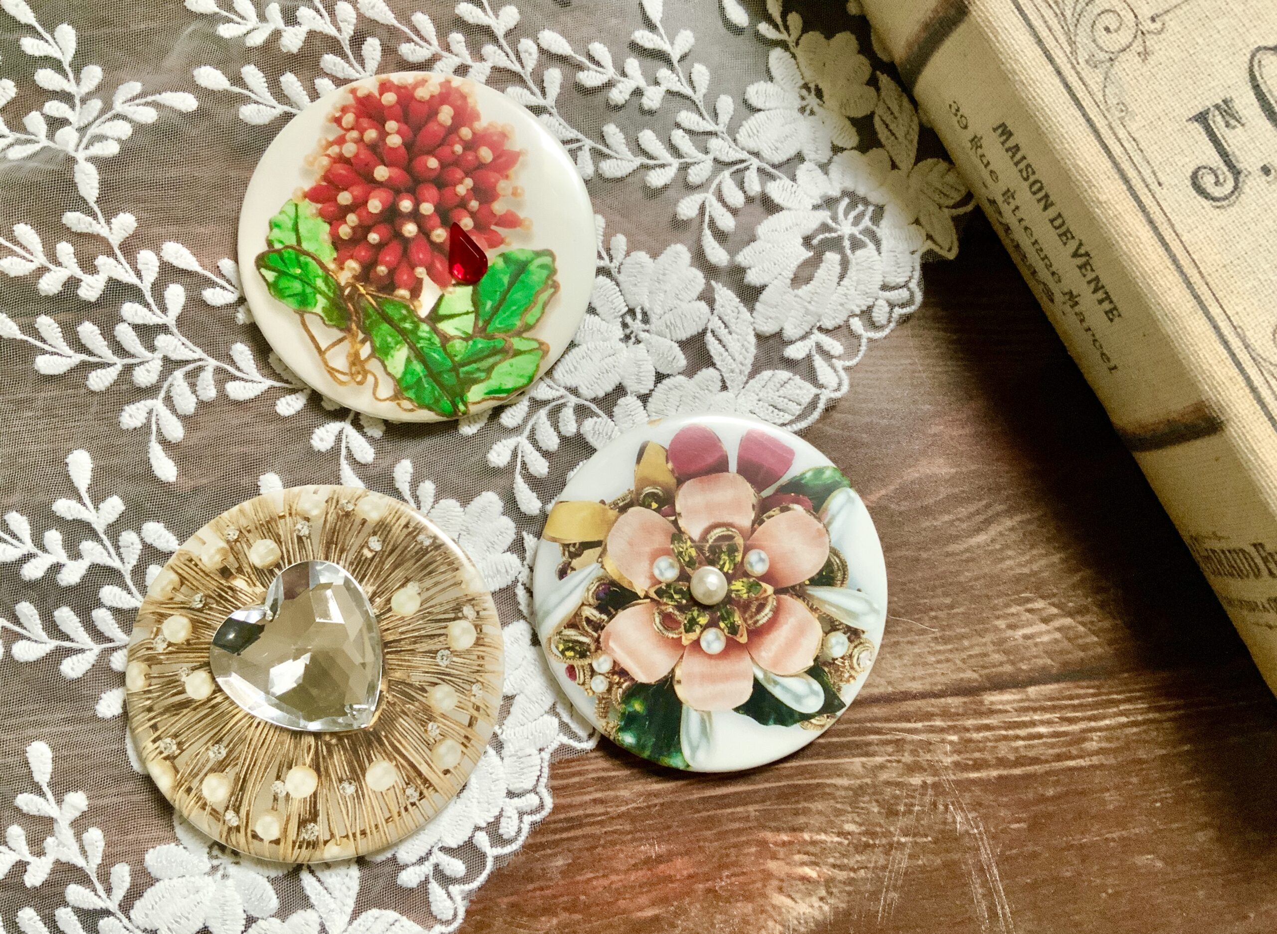 缶バッジというとメンズライクでカジュアルな印象があったのですが、写真プリントにキラキラのビジューを貼り付けた缶バッジは、もはやアクセサリーとして映えるぐらいのエレガントさも兼ね備えているようです。