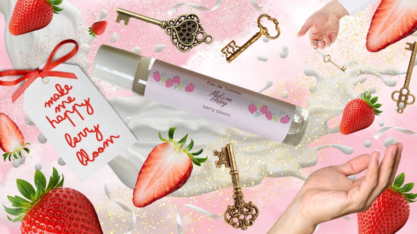 ロールオンタイプのフレグランス「メイクミーハッピー オードトワレ」からは、ベリーフローラルの香り<berry bloom/ベリーブルーム>が新登場。パッケージにもベリーが描かれていました。