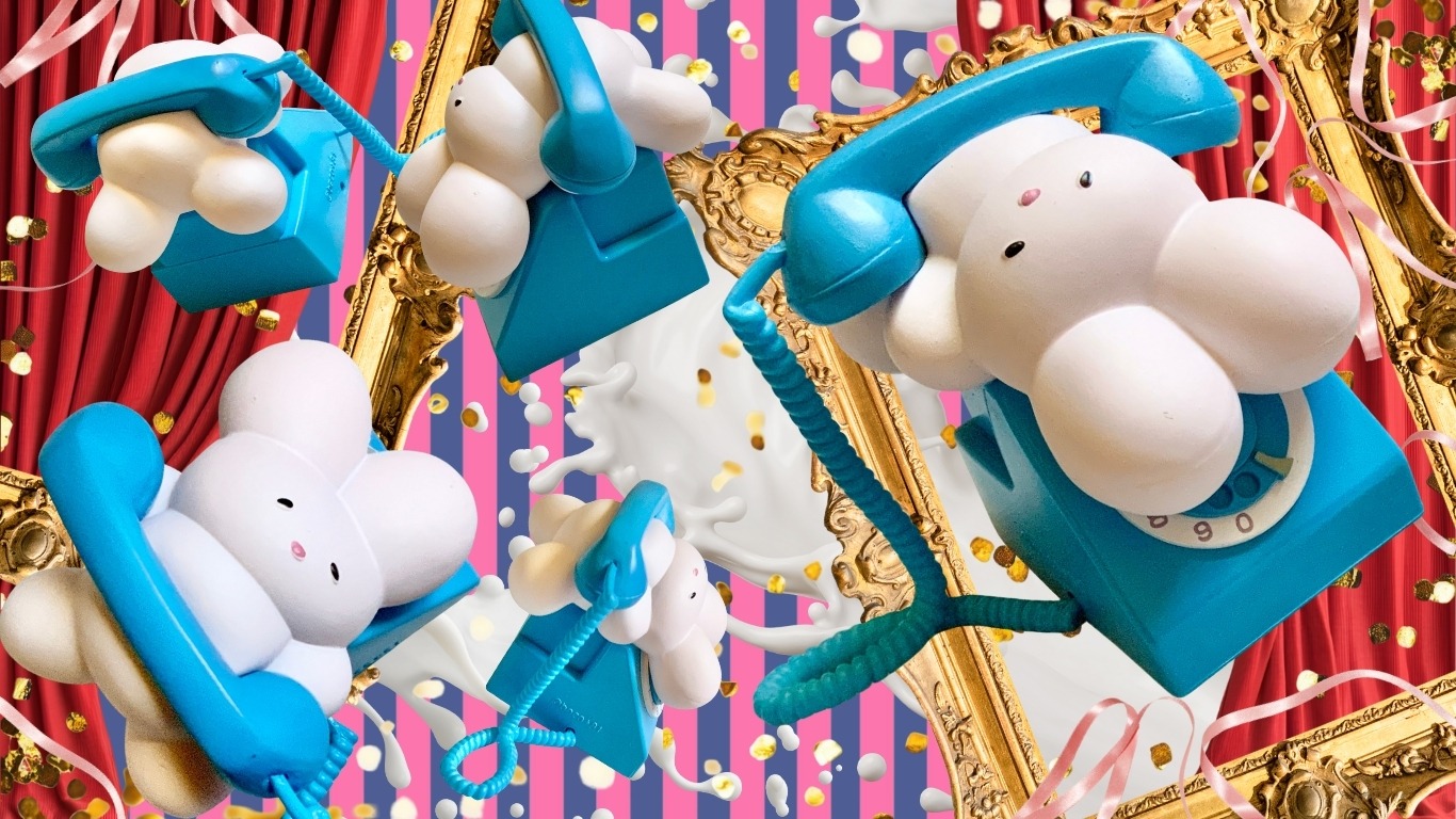 鮮やかなブルーのレトロな電話機のうえに、グダ〜っと寝転がるしりみみうさぎちゃんがなんともキュート。困っているような、笑っているような、眠たいだけのような、電話を待ち疲れてしまったような……角度によって違って見える表情も魅力的。